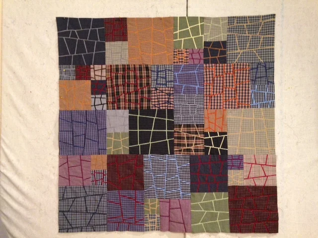 Made from re-purposed plaid shirts I bought at Goodwill, this top is composed of 4-inch squares, 6-inch squares, 8-inch squares, 10-inch squares, and 12-inch squares. Each square is fine-line pieced using the method devised by Kathleen Loomis, an art quilter whose work I very much admire. Here are her instructions for fine-line piecing, which I adapted a little bit.